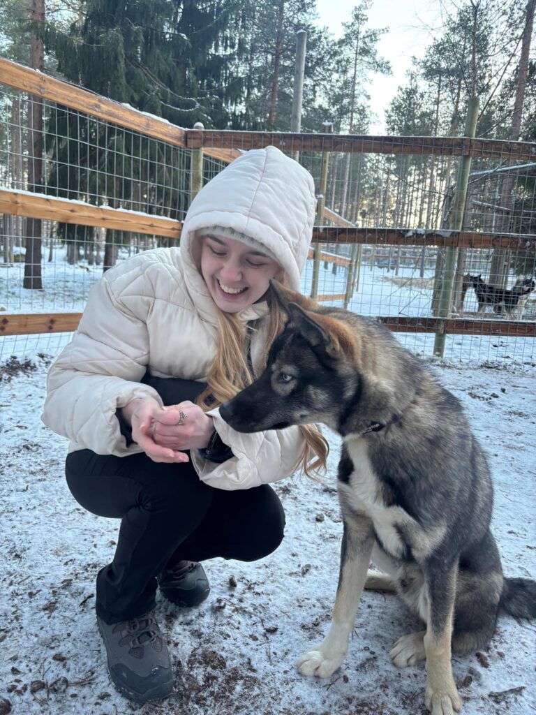 One of our standout experiences was husky sledding. Being pulled through snowy forest trails by a team of experienced dogs was easily the highlight of the trip and one of those activities that genuinely feels once‑in‑a‑lifetime. We also got time to wander around the husky complex and interact with all of the dogs, which was super fun.